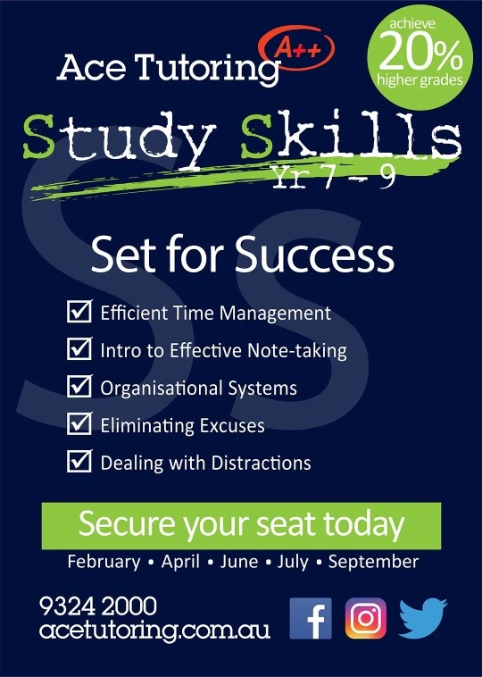 * DISCOUNT: If you book and pay for both the Year 7-9 Study Skills and Year 7-9 Advanced Study Skills Course at the same time we will discount them both to $109 each course saving $60.